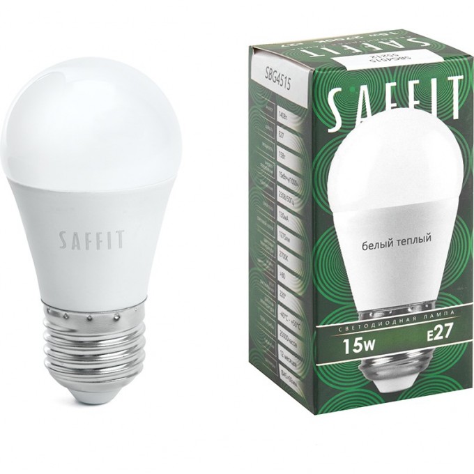 Лампа светодиодная SAFFIT SBG4515, G45 (шар), 15W 230V E27 2700К (белый теплый), рассеиватель матовый белый, 1275Lm, угол рассеивания 220°, 92*45мм