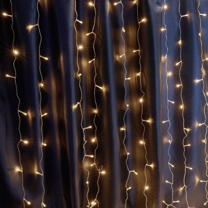 Гирлянда дождь FERON CL18, 160LED, 2700К (теплый белый), с эффектом стробов, 1,5*1,5м+3м прозрачный шнур, расстояние между светодиодами 9,4см, IP44, 8W, от сети 230V, последовательное подключение до 5 гирлянд